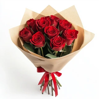 Этот букет из девяти красных роз — настоящий символ любви и страсти. Каждая роза, с яркими и насыщенными лепестками, излучает тепло и нежность, создавая атмосферу романтики. Их изысканная форма и глубокий цвет привлекают внимание и дарят радость. Букет оформлен в стильной крафтовой упаковке, которая добавляет нотку естественности и утонченности. Простой, но элегантный дизайн подчеркивает красоту самих цветов и создает гармоничное сочетание с их яркостью.